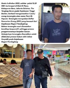 Senin 6 oktober 2025, sekitar pukul 12.25 WIB bertempat di Blok M Plaza, Kebayoran Baru, Jakarta Selatan, Tim Tangkap Buron pada Kejaksaan Tinggi Banten, berhasil mengamankan 1 (satu) orang tersangka atas nama Tomi M. Payumi. Tersangka merupakan Daftar Pencarian Orang (DPO) yang berasal dari Kejaksaan Negeri Pandeglang.