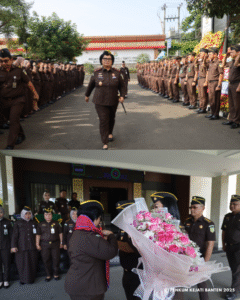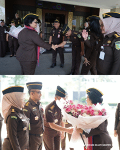 Senin, 27 Oktober 2025, bertempat di halaman Kantor Kejaksaan Tinggi Banten, para Asisten beserta seluruh pegawai pada Kejaksaan Tinggi Banten menyambut kedatangan Kepala Kejaksaan Tinggi Banten, Bernadeta Maria Erna Elastiyani, S.H., M.H. Acara berlangsung dengan penuh kehangatan dan kekeluargaan, diiringi antusiasme seluruh pegawai dalam menyambut kehadiran pimpinan baru.