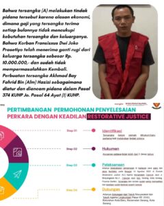 Perkara ini memenuhi syarat sesuai Peraturan Jaksa Agung Nomor 15 Tahun 2020, antara lain tersangka baru pertama kali melakukan tindak pidana, ancaman pidana tidak lebih dari lima tahun, serta kerugian yang ditimbulkan telah dipulihkan.